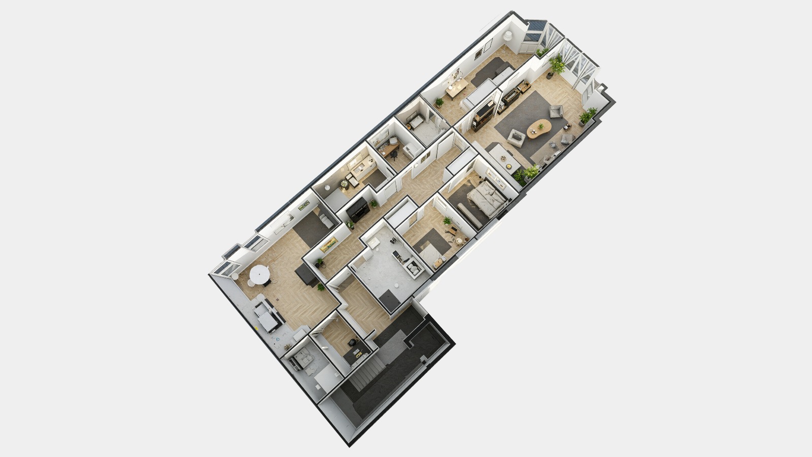 En sus 152,74 m² esta tipología de vivienda es ideal para la vida familiar. Cuenta con tres dormitorios espaciosos, dos baños completos y una cocina independiente para facilitar la organización diaria. Los espacios de circulación y el vestíbulo conectan las estancias, mientras el lavadero y el tendedero aportan funcionalidad. En el diseño se ha priorizado la luz natural y el confort, permitiendo habitaciones el uso versátil de espacio, lo mismo para descansar, trabajar o recibir invitados.