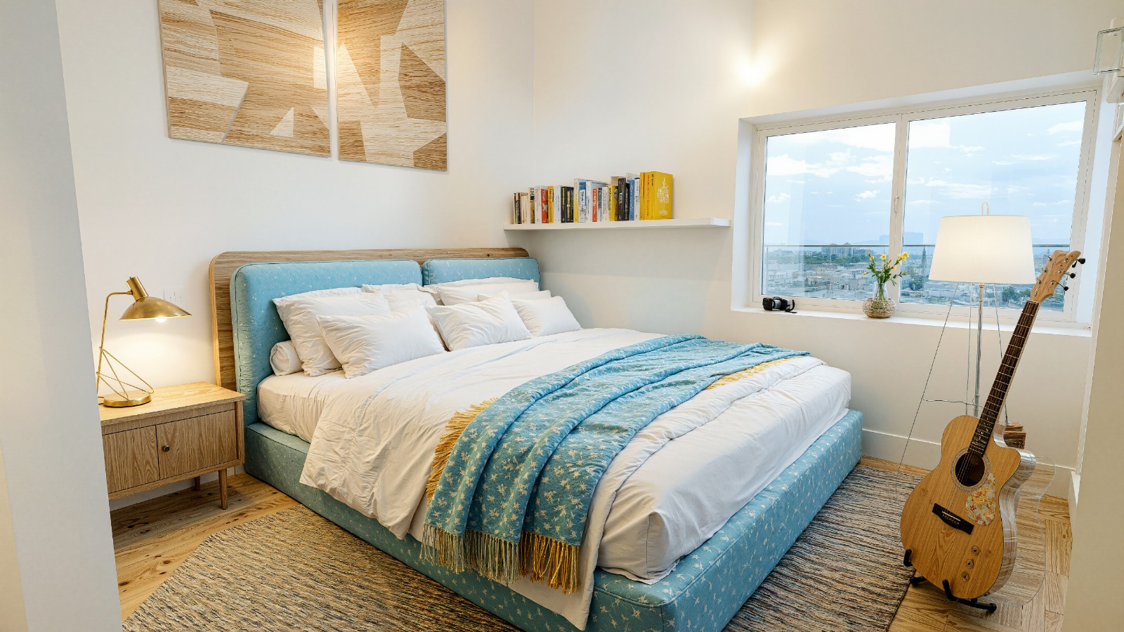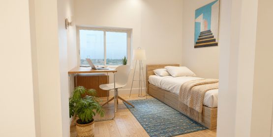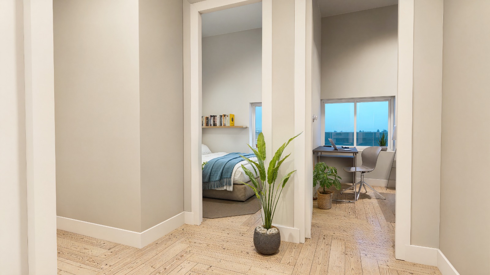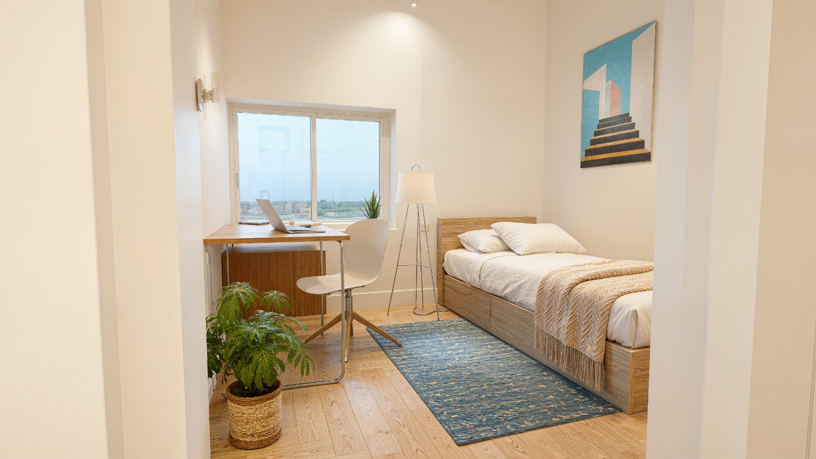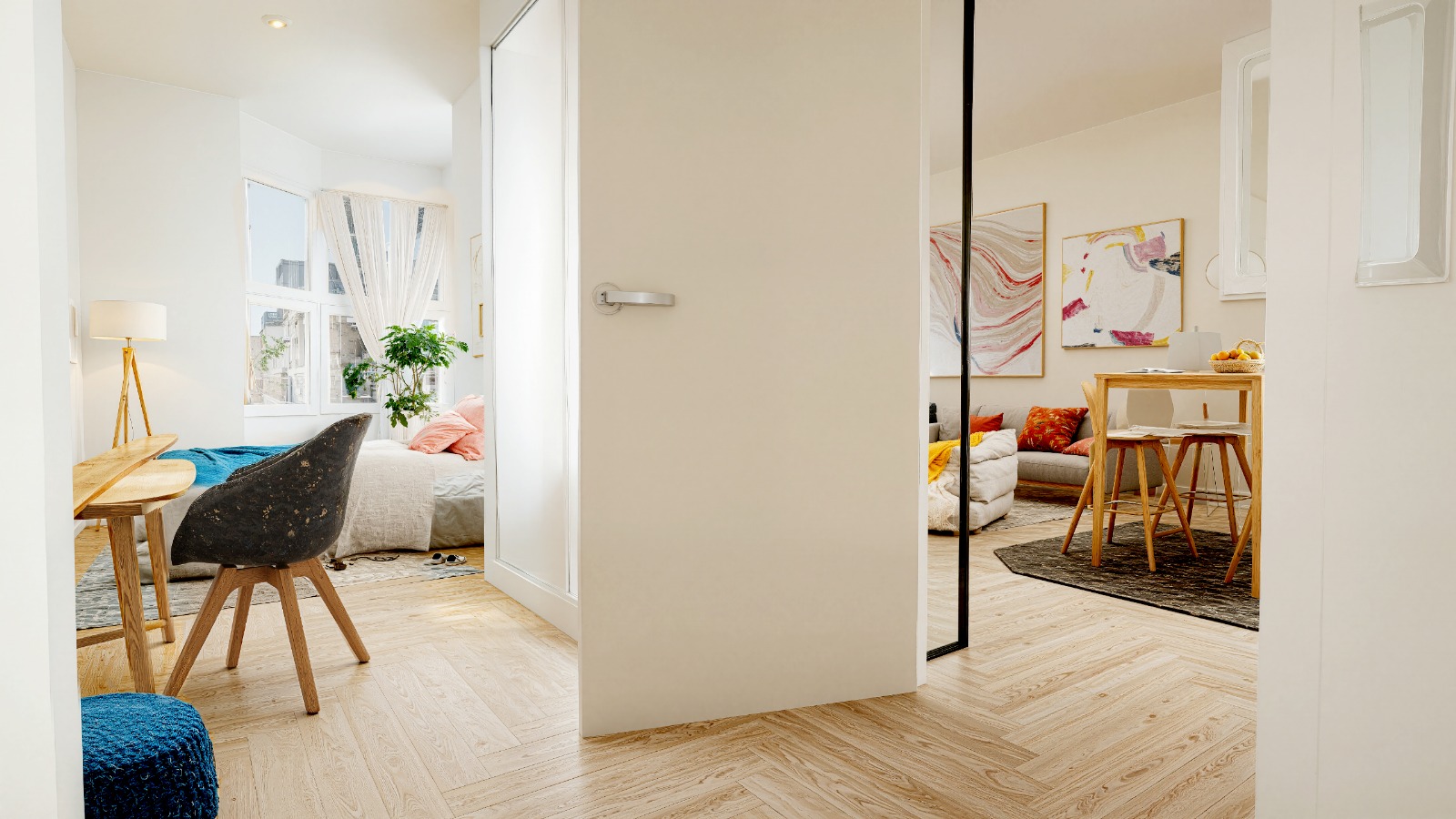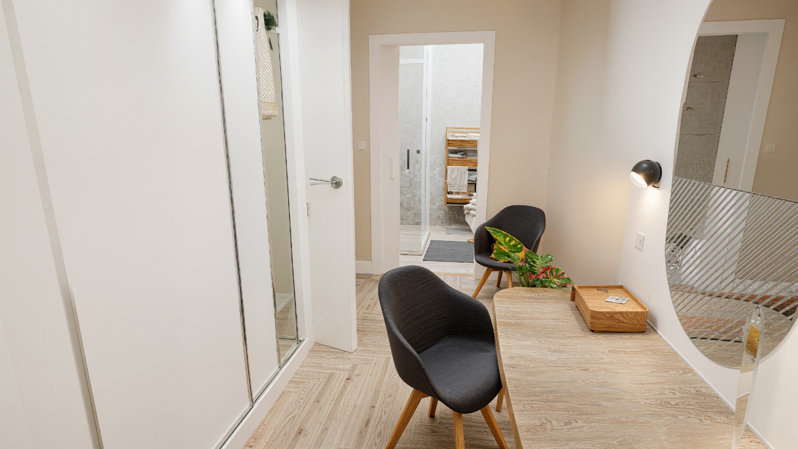 Este estudio moderno de 47 m² maximiza cada metro cuadrado para no sacrificar el confort y el orden. El espacio diáfano principal de gran tamaño integra zona de estar, dormitorio y cocina de manera fluida. Cuenta, además, con un baño completo y un lavadero independiente. El espacio ideal para una persona o pareja que busca confort y fácil mantenimiento en un formato compacto y muy luminoso.