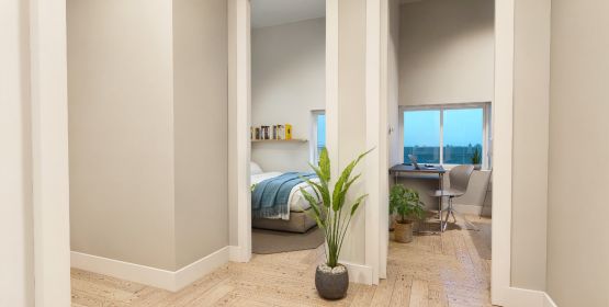 Esta vivienda de 41,21 m² fue diseñada para el aprovechamiento del espacio. Cuenta con una pieza única abierta que funciona como sala, dormitorio y cocina integrada; además tiene un baño completo y la zona de lavadero. Más allá de los acabados y la modernidad de este estudio, el elemento que más destaca de esta propuesta es una terraza generosa con poco más de 25 m. Sin dudas, una solución práctica y atractiva para quienes buscan una vivienda compacta con una importante conexión exterior.